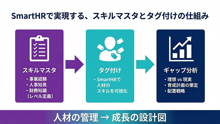 経営として重要になってくるのが、人材ポートフォリオの再構築が順調に進んでいるのかということです。そのためには、明確になったCWSの人物像から必要なスキル要件を具体化し、候補者の現状とのギャップを把握できるようにする必要があります。そして、このスキルの可視化と管理の基盤として、私たちはSmartHRを活用していく方針です。